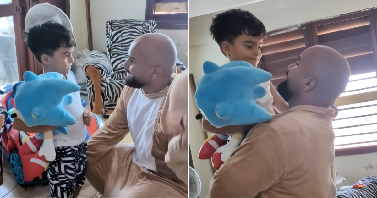 L'enfant, qui tient un peluche de Sonic dans ses bras, reste quelques secondes sans mots en reconnaissant son père sous le déguisement, avant de l'enlacer avec tendresse.