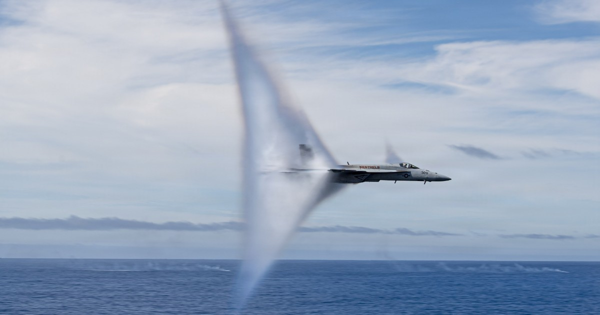 La Marine américaine a publié des images de la démonstration qui comprenaient un chasseur F/A-18 Super Hornet de l'escadron VFA-137 "Kestrels" brisant le mur du son au-dessus de l'océan, générant le cône de vapeur de condensation caractéristique autour du fuselage.